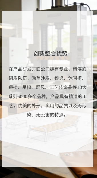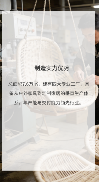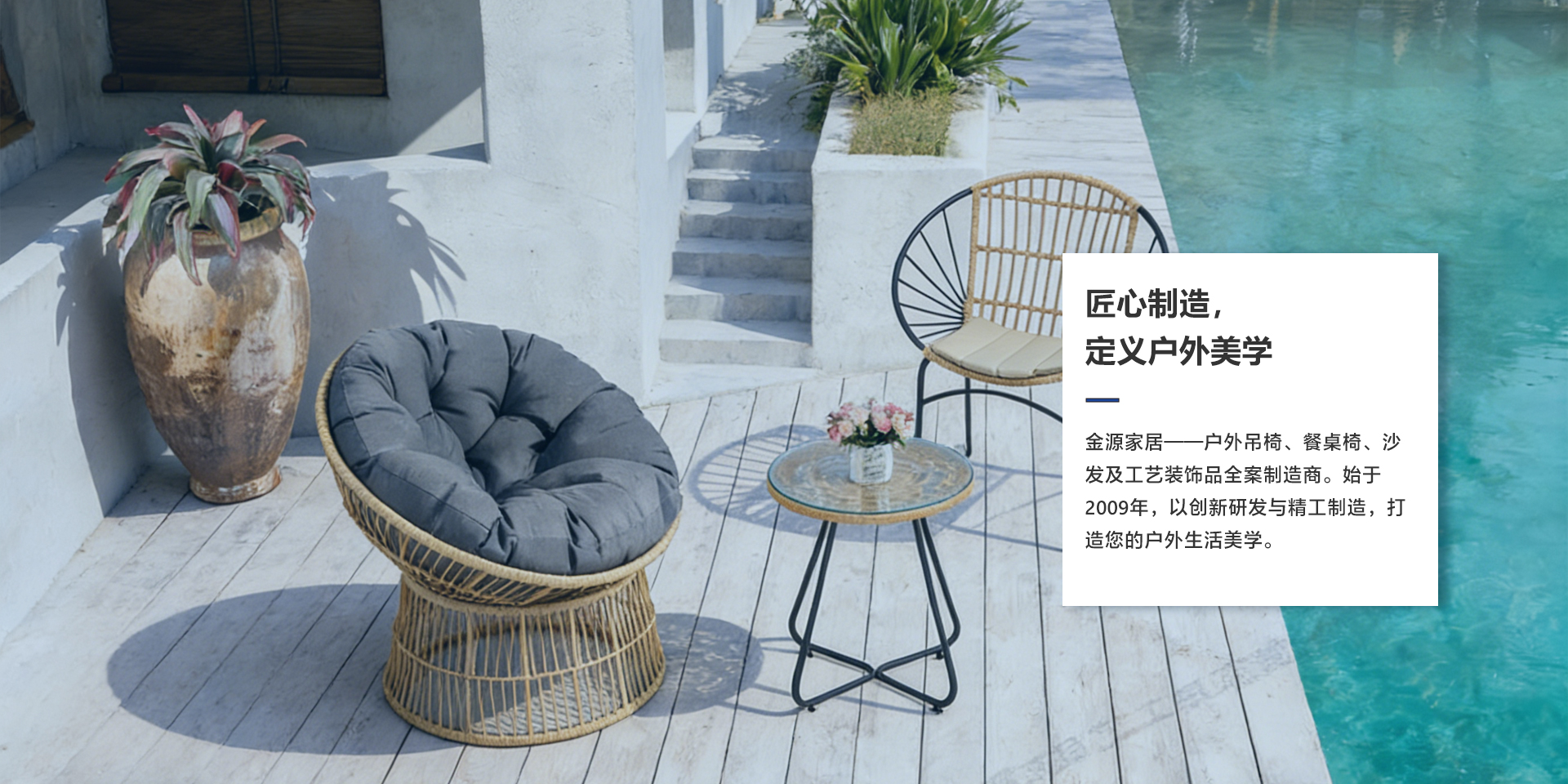 安徽金源家居工艺品有限公司成立于2009年,位于安徽阜阳经济开发区衡山路89号。企业占地面积7.6万平方米,建筑面积13万平方米,固定资产3.6亿元,员工600余人。主要产品以户外家具为主,涵盖吊椅、餐桌椅、沙发、工艺装饰品等品类,是一家以创新研发为先导,科技制造与营销服务为核心的综合型家具制造企业。公司旗下拥有家居装饰工艺品厂、户外家具厂、软体室内家具厂、定制化家具厂四大独立运作的生产体系。